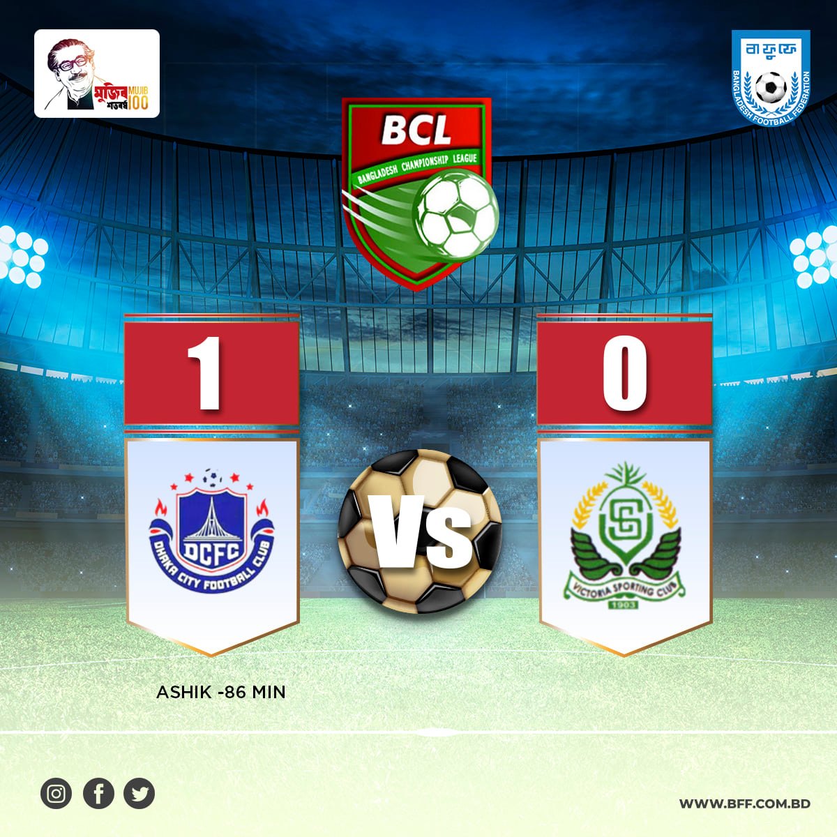 Today's match of Bangladesh Championship League 2020-21 has been played at Bir Sherestha Shaheed Shipahi Mostafa Kamal Stadium between Dhaka City Football Club Ltd. and Victoria Sporting Club, Dhaka at 7:00 PM. In the match, Dhaka City Football Club Ltd. defeated Victoria Sporting Club, Dhaka by 1-0 goal. For Dhaka City Football Club Ltd., Md. Ashik Miah scored a goal in 86th minutes.