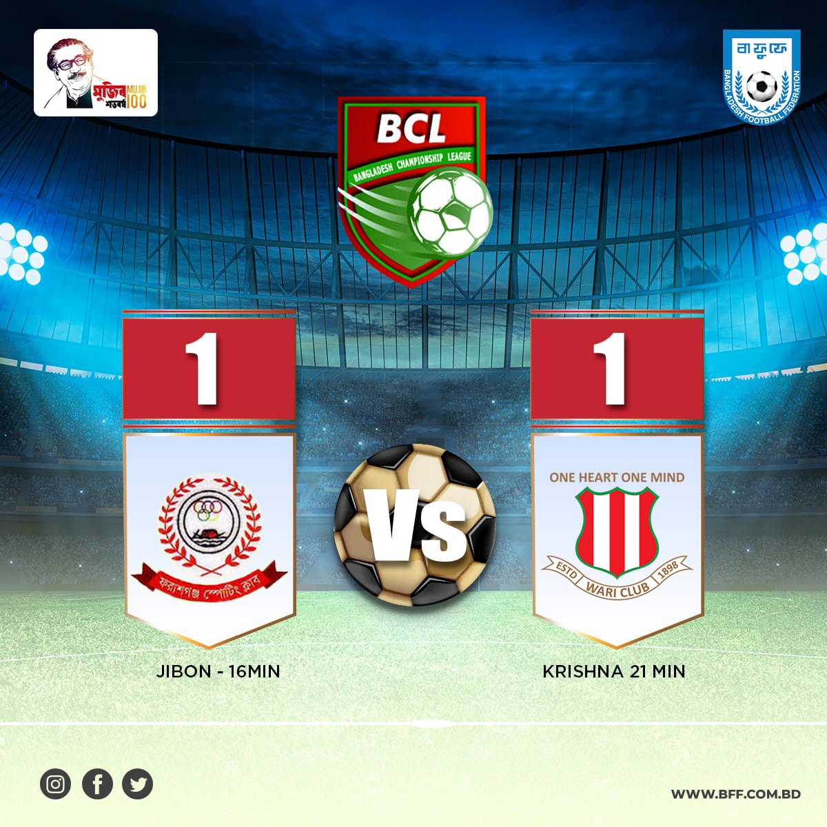 Today's match of ‘Bangladesh Championship League 2020-21’ has been played at Bir Sherestha Shaheed Shipahi Mostafa Kamal Stadium between Farashgonj Sporting Club and Wari Club, Dhaka at 5:00 PM. The match was held to draw by 1-1 goals. For Farashgonj Sporting Club Jibon scored a goal in 16th minutes and for Wari Club, Dhaka Krishna scored a goal in 21st minutes.