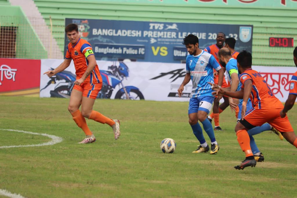 Today's match of 'TVS Bangladesh Premier League 2021-22' was held between Bangladesh Police Football Club Vs Uttara Baridhara Club. Bangladesh Police Football Club won the match by 3-2 goal. For Bangladesh Police Football Club, Sharif scored the first goal in the 13th minute & the third goal in the 51 minute and Danilo scored the second goal in the 48th minute. For Uttara Baridhara Club, Youssouf scored the first goal in the 72nd minute and Kochnev scored the second in the 90+2 minute.