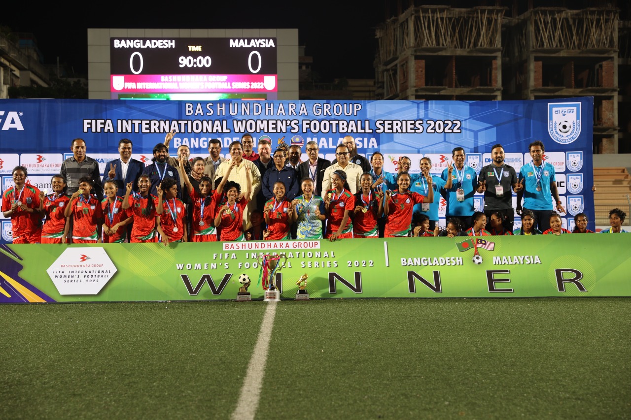 Under the overall management of Bangladesh Football Federation the last match of "Bashundhara Group FIFA International Women's Football Series 2022" between Bangladesh Women's National Football Team and Malaysia Women's National Football Team was held today at Birshreshtha Shaheed Sepahi Mohammad Mostafa Kamal Stadium in Kamalapur. The match ended in a goalless draw and Bangladesh Women's National Football Team won the title of "Bashundhara Group FIFA International Women's Football Series 2022".