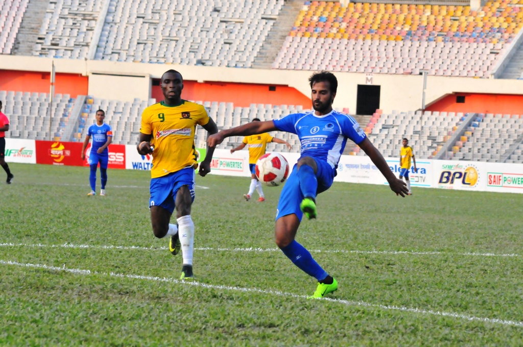Khalekuzzaman Sobuj, the hardworking midfielder of Sheikh Russel restored the parity in the 37th minute with an outstanding strike. Receiving a lob of skipper Shahedul Alam at the top of the box, Sobuj made a horizontal run past defenders and turned around before unleashing a fierce left footer at the far post net (1-1).