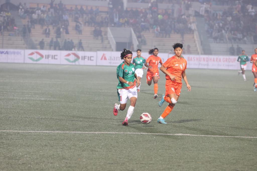 The match of "SAFF U-20 Women’s Championship 2023" between Bangladesh U-20 Women’s National Team and India U-20 Women’s National Team was held at Bir Shreshtha Shahid Shipahi Mostofa Kamal Stadium at 7:00 pm (Bangladesh Time). The match was drawn by 0-0.